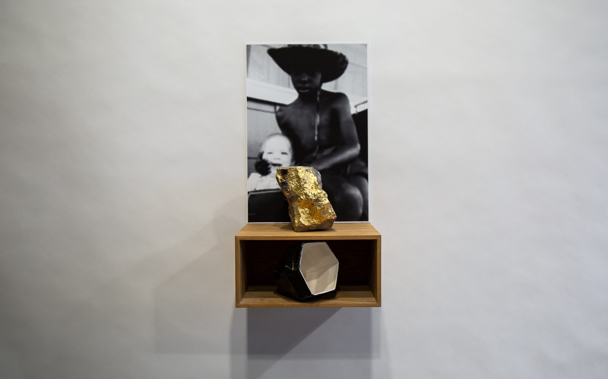 Reflecting upon my foster brother who I lost touch with. I went to the site of our early youth (Camden, New Jersey), and retrieved a fragment of the crumbling street that I then gilded, and placed like a relic within an oak altar form, a print of the only image I have of the two of us as children, a ceramic form, cast, glazed cracked and repaired with gold and lacquer in the Japanese tradition of kintsugi; when a state of brokenness is repaired with precious metals, our flaws cherished and celebrated.